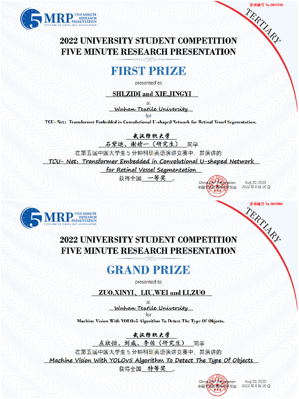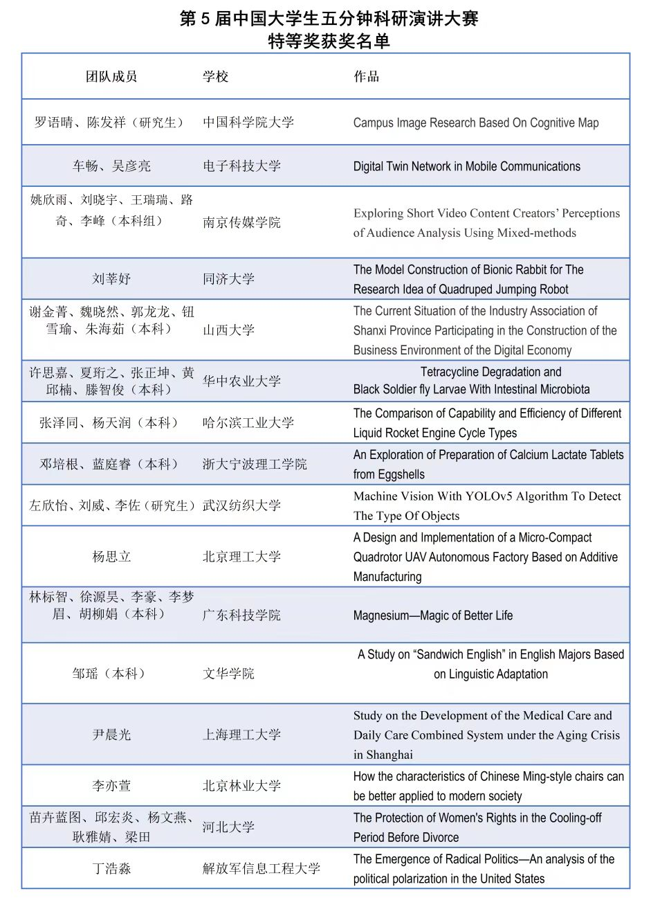 随着2022年8月12日和8月20日全国决赛的举办,历时将近半年、用英语陈述科研项目的第五届大学生五分钟科研演讲大赛落下帷幕。我校学子在本届大赛中取得了优异成绩。其中,来自机械学院的左欣怡同学及其团队成员刘威,李佐获得全国特等奖,其英语指导老师为51c吃瓜网每日大赛华敏、蔡倩老师,专业指导老师为马双宝、沈满德老师。来自电子与电气工程学院的石紫迪和些婧一同学获得全国一等奖,其英语指导老师为51c吃瓜网每日大赛的蔡倩老师。另外,还有其他来自管理学院,材料学院和化工学院的8位同学及其团队分别荣获全国二等奖和三等奖。特别值得关注的是管理学院研究生一年级的潘帆同学,在参加比赛时还是一名本科生。在其导师周新建博士的指导下荣获三等奖的好成绩。