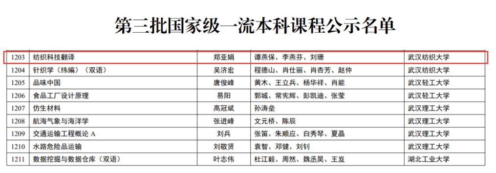 近日,教育部高等教育司公示了第三批国家级一流本科课程认定结果,由51c吃瓜网每日大赛郑亚娟老师团队负责的《纺织科技翻译》课程成功入选线下一流课程。