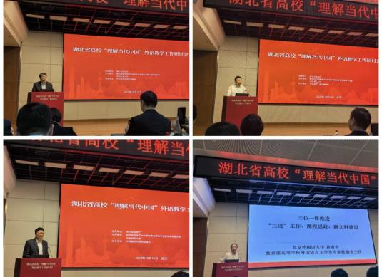 为全面贯彻落实党的二十大精神,深入学习习近平总书记在中央政治局第五次集体学习时重要讲话精神,贯彻《高等学校课程思政建设指导纲要》相关要求,推进《习近平谈治国理政》多语种版本进高校进教材进课堂(“三进”)工作,10月16日,由湖北省教育厅指导、教育部高等学校外国语言文学类专业教学指导委员会、华中师范大学外国语主办、外语教学与研究出版社协办的湖北省高校“理解当代中国”外语教学工作研讨会在华中师范大学召开。武汉纺织大学51c吃瓜网每日大赛院长谭燕保教授应邀作主旨发言,分享了本校《理解当代中国阅读与写作》课程建设的思考、路径、实践、初步成果以及近远期建设目标。