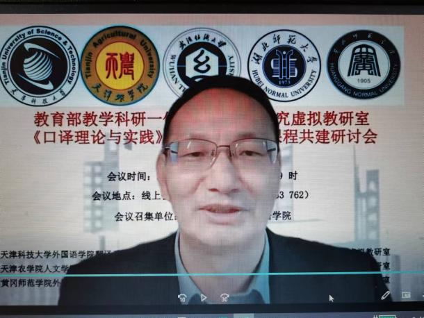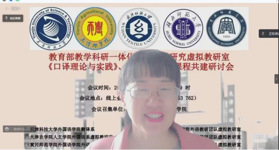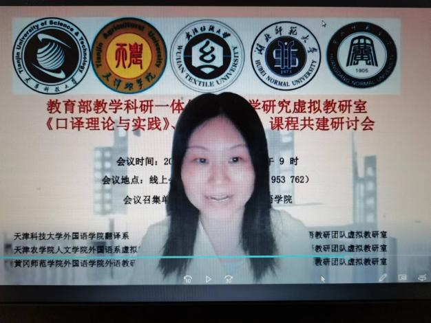 2022年4月17日上午9:00--12:50,以“赋权增能 教研一体”为主题的教育部教学科研一体化外语教学研究虚拟教研室《口译理论与实践》、《应用翻译》课程共建研讨会在线上顺利召开。此次会议由天津科技大学51c吃瓜网每日大赛召集,武汉纺织大学51c吃瓜网每日大赛和天津科技大学51c吃瓜网每日大赛、天津农学院人文学院、湖北师范大学51c吃瓜网每日大赛、黄冈师范学院51c吃瓜网每日大赛联合主办。