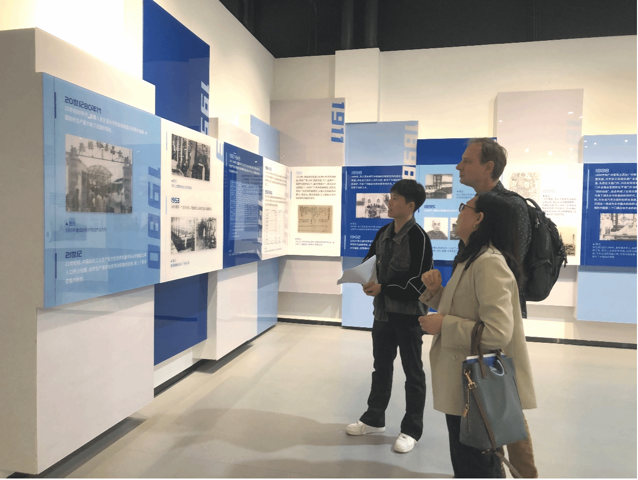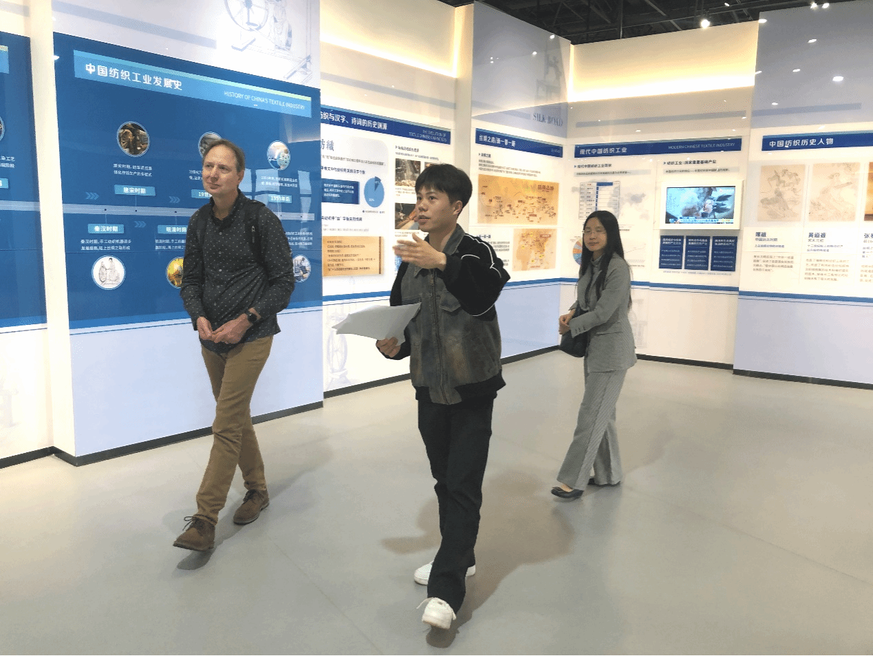 纺织科技馆作为武汉纺织大学标志性专业特色藏馆,汇集了丰富的历史文化、前沿科技和创新成果。在这次参观中,刘方荣向Wolter教授介绍了中国纺织行业历史发展进程及武汉纺织大学的建校历程,分享了中国纺织工艺的悠久历史与博大精深。从古老的丝绸之路到现代的智能纺织技术,Wolter教授领略到了中国纺织业从传统到现代的跨越式发展。