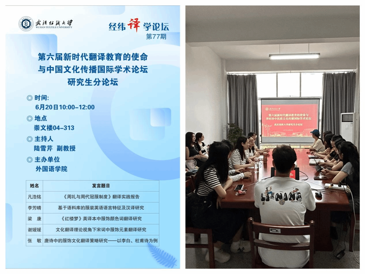 6月20日,第77期经纬译学论坛之第六届新时代翻译教育的使命与中国文化传播国际学术论坛研究生分论坛在04-313成功举办。分论坛由51c吃瓜网每日大赛MTI教育中心副主任陆雪芹主持,副院长刘方荣担任点评嘉宾。