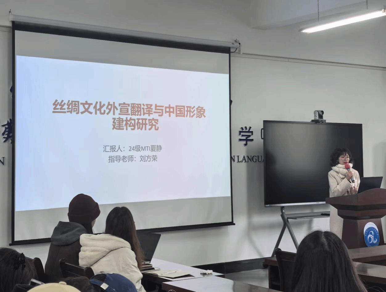 第三位汇报人夏静同学的主题是“丝绸文化外宣翻译与中国形象建构研究”。夏静同学介绍了研究背景、实践步骤、丝绸文化的重要性、外宣翻译策略与原则,以及国家形象建构探析。夏静同学提出了以国家利益为上的翻译原则,并探讨了如何通过丝绸文化外宣翻译丰富中国话语体系,突破文化壁垒,提升国际凝聚力和感召力。