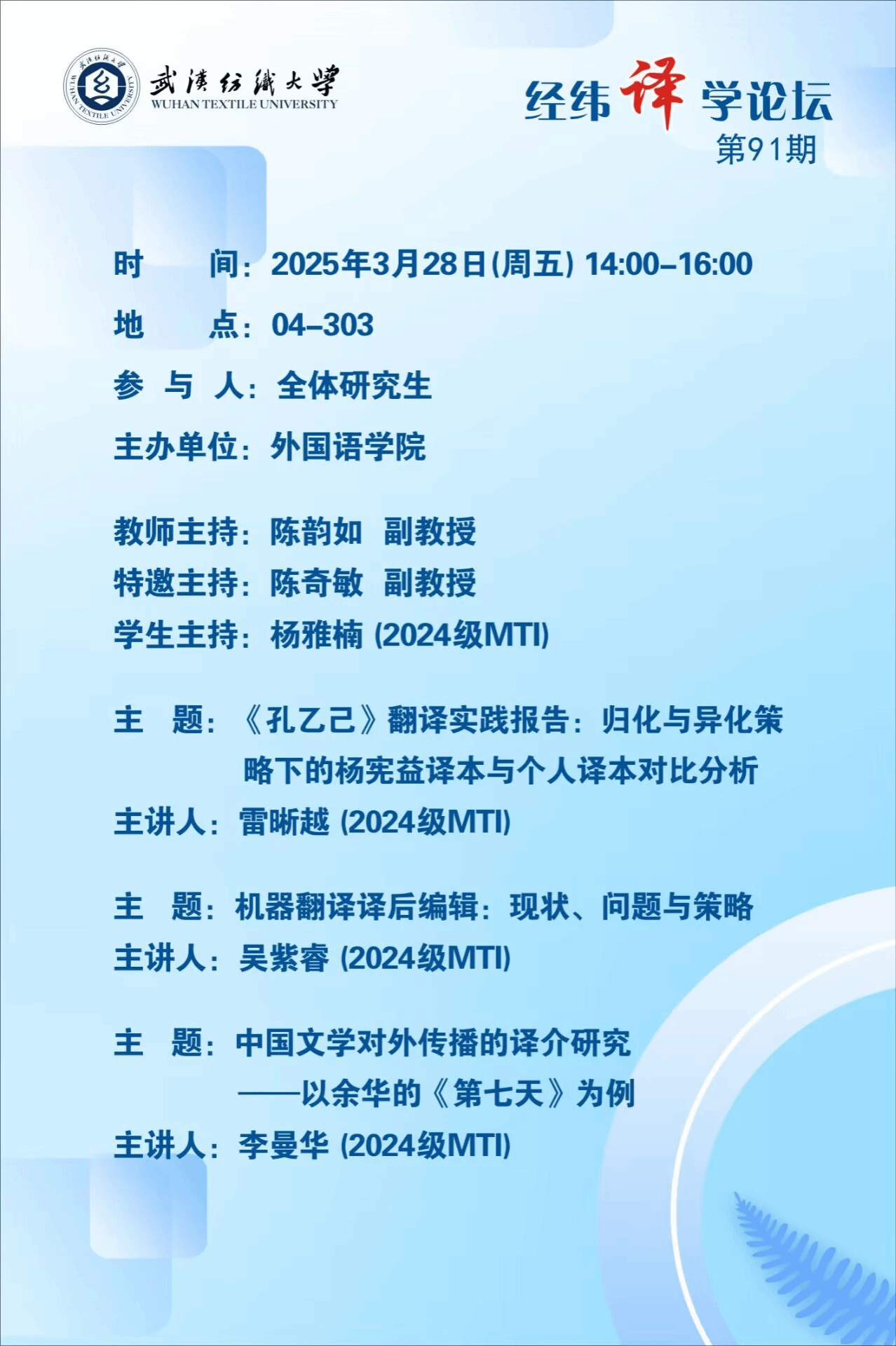 3月28日,51c吃瓜网每日大赛在崇文楼303教室成功举办了第九十一期“经纬译学”研究生论坛。本次论坛由陈韵如副教授和陈奇敏副教授担任教师主持,24级MTI杨雅楠同学担任学生主持。论坛邀请了三位主讲人,分别是24级MTI的雷晰越、吴紫睿、李曼华三位同学。24级全体研究生参与了此次论坛活动。