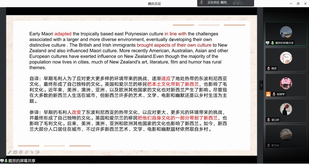 本次沙龙由陈奇敏副教授主持,20级MTI研究生戴思和赵淑琴主讲。戴思同学以“CATTI英译汉真题及《人类减贫的中国实践》白皮书翻译赏析”为主题,分享了一篇介绍新西兰文化背景的文章,展现了新西兰多元化文化特点以及翻译此类文本的重点与难点。随后,老师和同学们就“sense of place”、“adapt”、“cultural engagement”在文中的如何恰当翻译等问题进行了激烈讨论。最终,各位师生认为“sense of place”是一种民族认同感;对于“adapt”的翻译,我们首先要把握住“adapt”的核心含义,再结合上下文逻辑,抓住译文表达流畅这一重点。对于原文中的“cultural engagement”,毛利文化及他国文化为新西兰文化的形成有一定贡献,可以理解为“文化参与”,在该语境中,“engagement”译为“参与”也是一种约定俗称的表达。