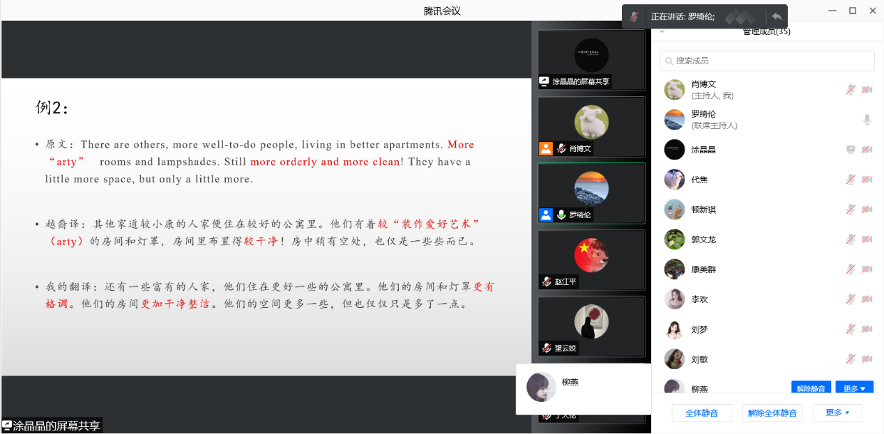 两位同学的分享结束后,罗院长也针对内容做了点评。针对熊孟兰同学的分享,他肯定了内容的时效性和趣味性,也认同了分句进行分析和讲解,但提出了讲解过程中应当适当放慢速度,给同学们留下理解和思考的空间,例如提出上述问题时应该稍作停顿,线上讲座应如线下的演讲一般让听众有反应的空隙。针对涂晶晶同学的分享,于天伦同学提出“我们有时明知是翻译腔的表达而无法避免使用时该怎么办?”的问题,同学们在发表自己的意见后,罗院长认为我们无法用汉语表达出想要的意思是因为我们的汉语水平仍需提高,双语能力要同时加强,提高的方法就是要通过大量的阅读积累。此后,同学们分别针对四句话都提出了新的看法,碰撞出思维的火花。