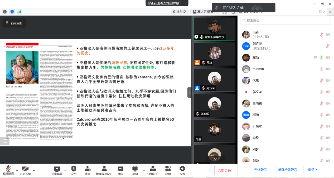 针对左灿同学的汇报,刘方荣老师首先指出,要注意外刊中的讣告与中文的讣告不一样。中文的讣告只是告知某个人离世,而外刊中的讣告会对人物进行介绍,介绍生平事迹,建立亲密关系等,确实具有文学性。其次,对于文本翻译中,刘老师指出,翻译时要名词统一化,例如“Yaghan雅格汉人”的翻译。其次,对于讨论的“rough”的翻译,不能简单地理解为“艰难”;“setting out on the water”不一定是“漂向水面”,要结合语言坏境,进行增译。