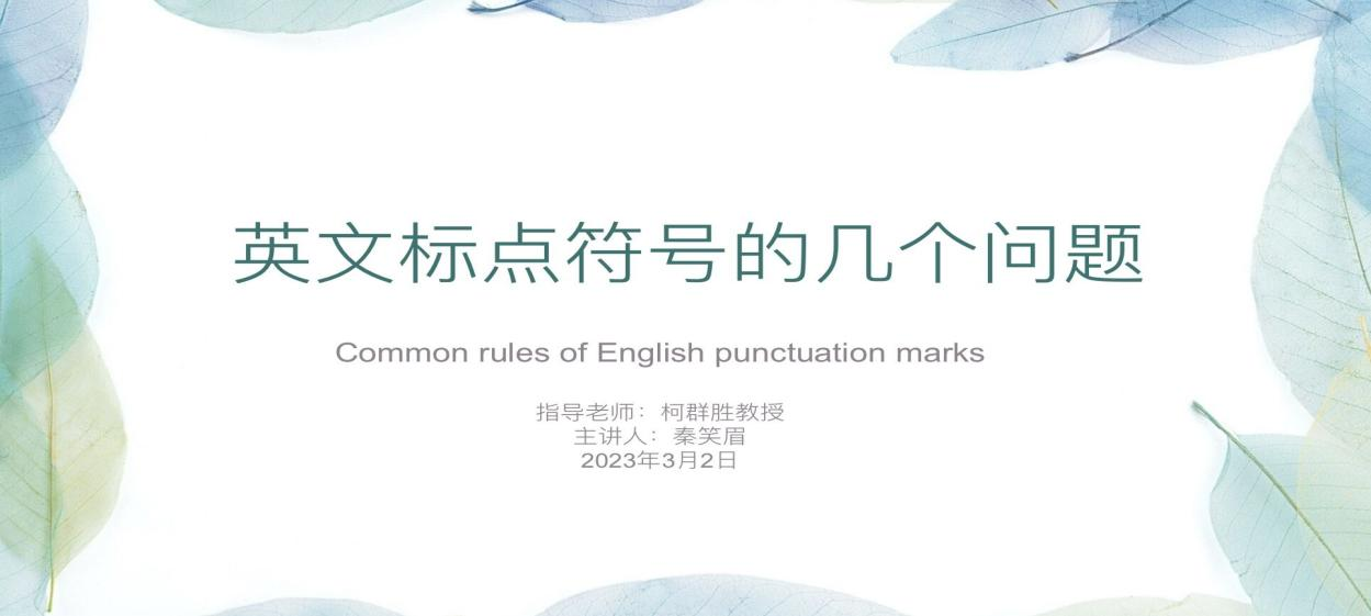 第一位汇报人秦笑眉同学分享的是英文标点符号的几个问题。秦笑眉具体讲解了句号、冒号、撇号、引号这四种英文标点符号的意义与用法,提到了英语学习过程中容易被忽视的标点符号细节问题,同学们在此基础上,探讨了论文写作时要注意的标点符号问题。