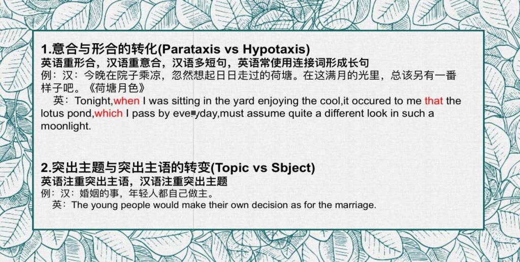 第二位汇报人王馨语同学分享的主题是英汉语序差异对比。分享内容分为三部分:造成英汉语序差异的原因、英汉语序差异的具体表现、应对语序差异的翻译策略,在翻译策略这一部分,具体讲述了意合与形合的转化,有灵主语与无灵主语转化,异化与归化共同使用的情景,上述翻译策略有利于指导翻译实践,并且对翻译学习有很大助益。