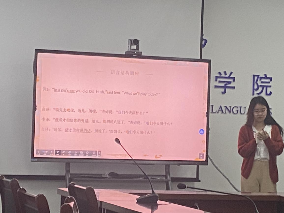 第二位汇报人吴静雯同学分享的主题是顺应论视域下的儿童文学翻译——以《杀死一只知更鸟》为例。她从作者、故事内容和主要人物三方面介绍了这本小说,然后向同学们讲解顺应论的相关知识,最后结合自译分析了高红梅、李超育译本的优点和缺点。