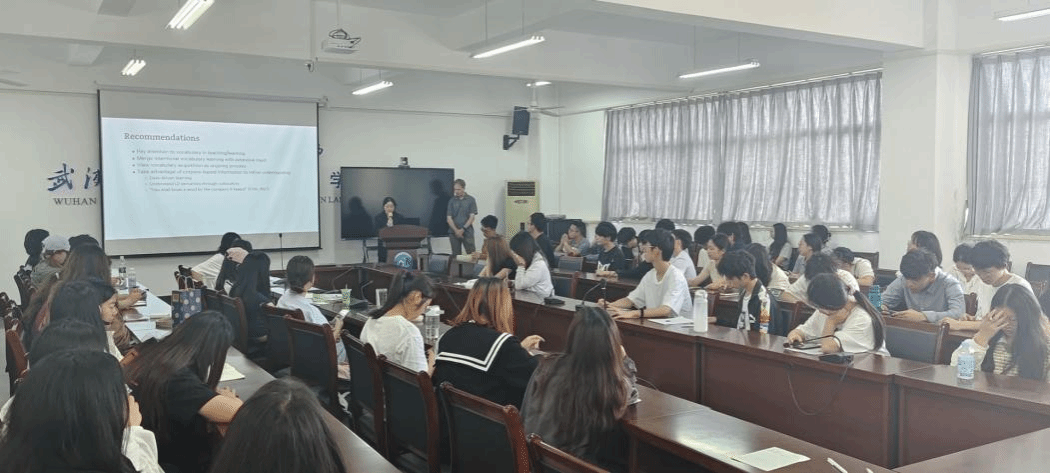 5月6日下午,世界著名科学家来鄂讲学计划专家、美国爱达荷州立大学的语言学家Prof. Brent Wolter在崇文楼为51c吃瓜网每日大赛师生作题为“Second language vocabulary acquisition: A beginning without an end?”的学术讲座。51c吃瓜网每日大赛副院长刘方荣、商务英语系主任吴志杰和英语及商务英语专业23级全体学生参加并聆听了本场讲座。讲座由商英12301班司嘉琪同学主持。