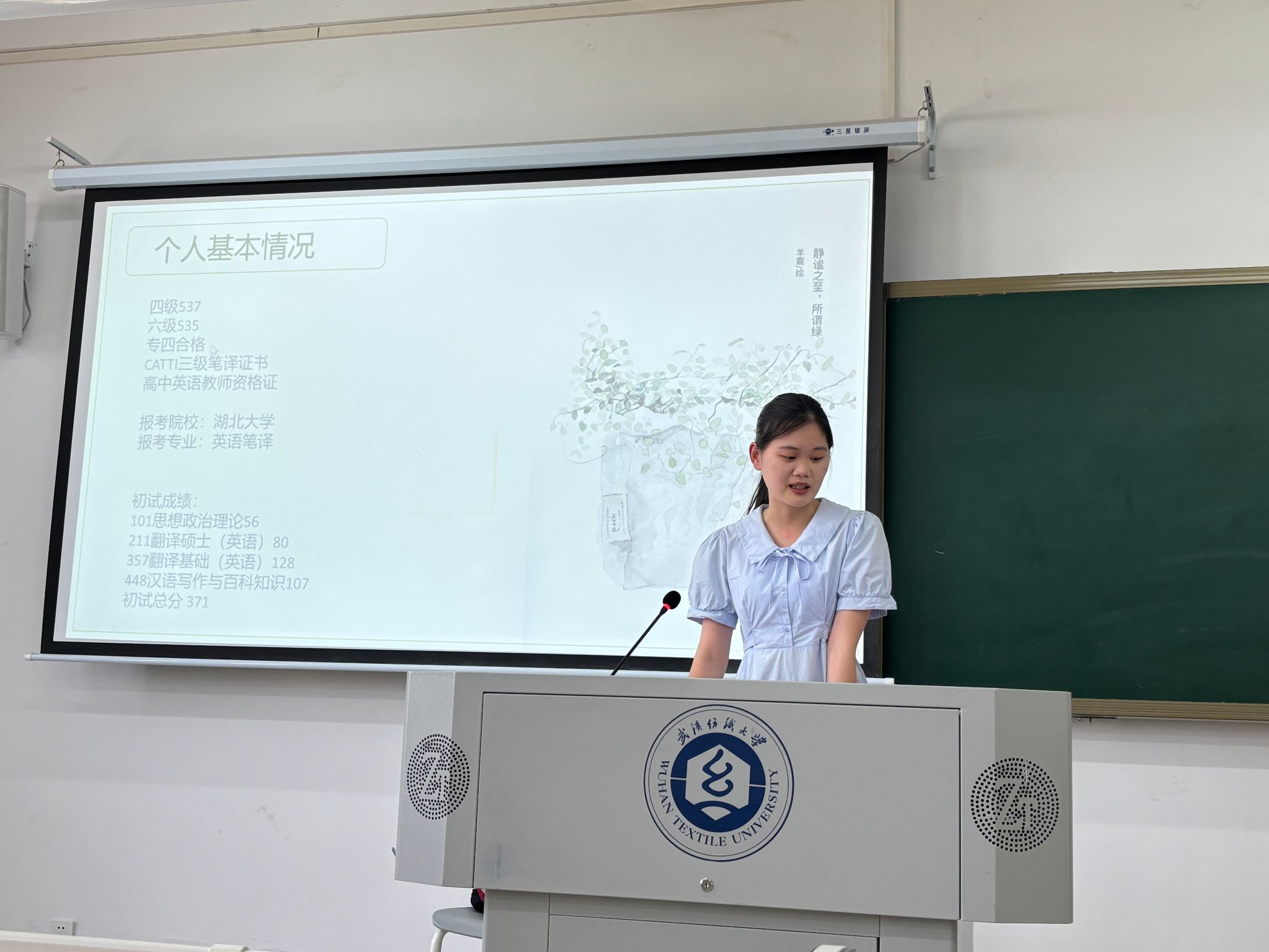 分享会伊始,成功考取华中师范大学翻译专业的周子涵同学进行分享,她分享了自己选择华师的初心,并从翻译专业的核心能力训练切入,强调每日翻译实战的重要性,分享了《英汉翻译简明教程》等实用学习资料,将晦涩的翻译技巧化作生动的学习指南。谈及公共课复习,她结合自身时间管理经验,建议同学们构建知识树体系,夯实基础,稳扎稳打。