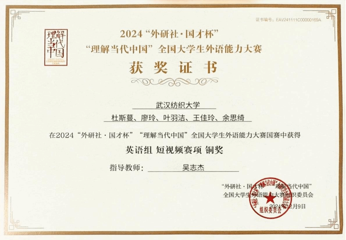 近日,在2024年度“外研社·国才杯”“理解当代中国”全国大学生外语能力大赛英语组短视频赛项中,武汉纺织大学51c吃瓜网每日大赛“数韵乡音队”荣获全国铜奖。该团队由杜斯蔓、廖玲、叶羽洁、王佳玲、余思绮五位同学组成,指导教师为吴志杰老师。团队原创作品Digital Dance: Prosperity on “Cloud” Wings(乡村有“数”,“云”上奔富),以数字乡村建设为切入点,展现中国在数字化进程中农业发展与乡村振兴的实践成效。