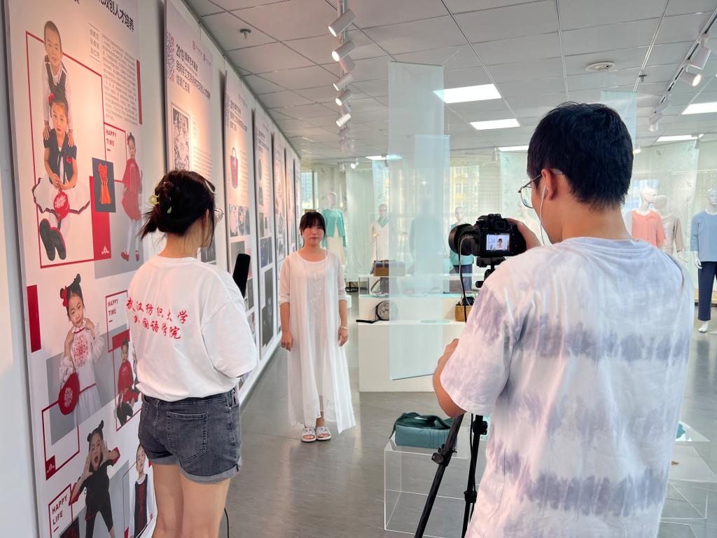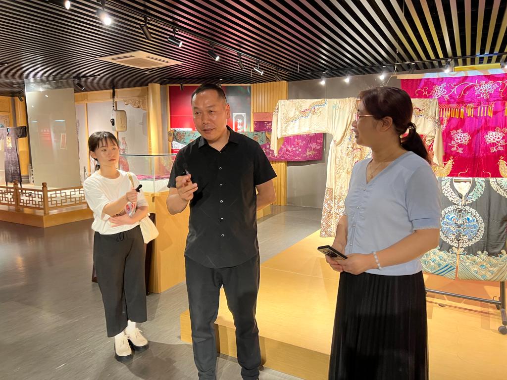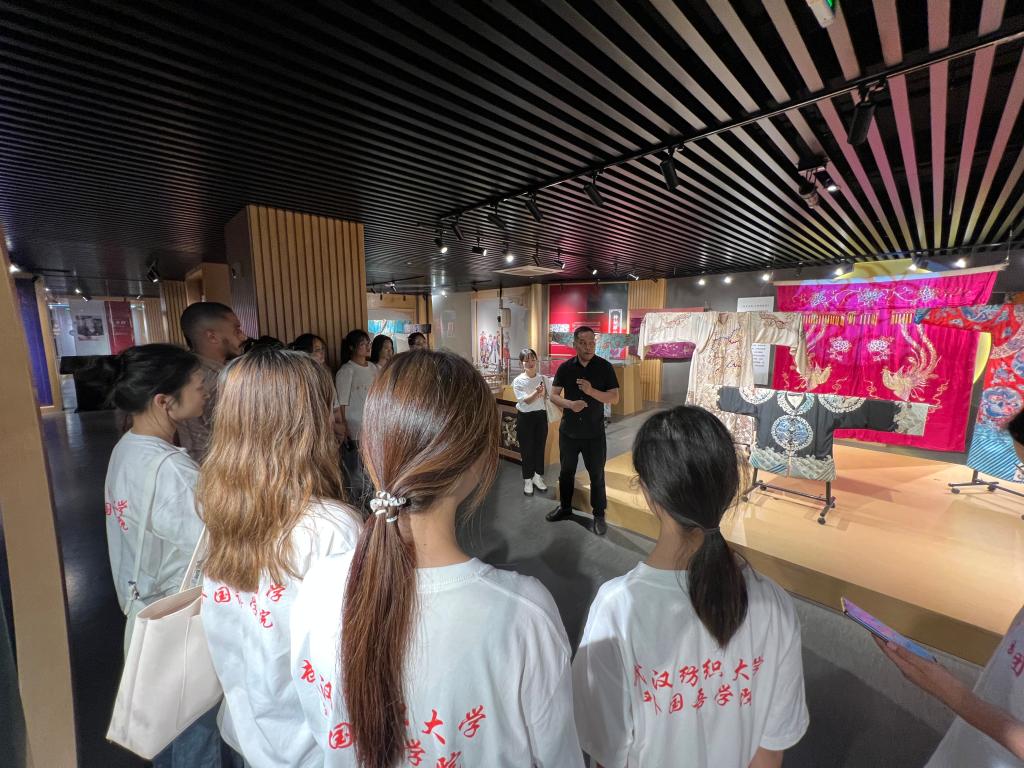 在湖北省非物质文化遗产研究中心,中心主任叶红光教授向实践团同学们介绍了荆楚纺织非遗的现状、传承谱系的建立和对外交流的反响与成果,对51c吃瓜网每日大赛的同学们能够关注荆楚文化和非遗的外译表示赞赏。叶红光表示,荆楚非遗是荆楚文化的重要组成部分,是传承技艺现代价值观的表达,其内涵不仅包含了中华优秀传统文化,也将现当代的“筚路蓝缕”的艰苦奋斗精神、“抚夷属夏”的开放包容精神、“上下求索”的锐意进取精神、“深固难徙”的爱国主义精神等精神谱系赋予其中。荆楚非遗的外译对荆楚文化的国际传播具有长远意义,希望51c吃瓜网每日大赛的同学们专心于此,专注于此,为荆楚文化的对外传播贡献自己的力量。非遗社团指导老师郎丽为实践团同学进行了展厅讲解。