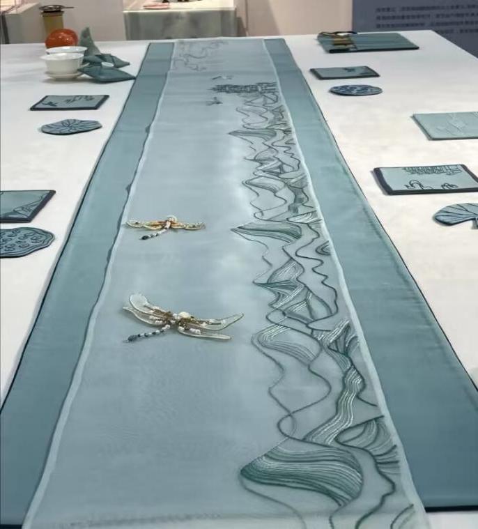 荆楚纺织非遗馆在武汉纺织大学南湖校区内,占地面积4000平方米。教育部中华优秀传统文化传承基地(汉绣)主任叶洪光教授和汉绣传承人王燕老师作现场讲解,向团队详细介绍了汉绣、黄梅挑花、红安绣活、阳新布贴、西兰卡普等在内的20余项荆楚地区纺织非遗项目。