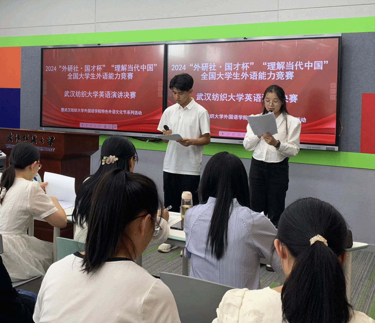 9月26日下午,学院组织新生现场观摩了2024“外研社·国才杯”“理解当代中国”全国大学生外语能力竞赛武汉纺织大学英语演讲决赛。本次演讲题目为“The Chinese Dragon is good”,选手们由此发散思维,大胆想象,提及蛟龙,悟空,嫦娥,天人合一,中西龙对比等内容。每个选手讲完后,进行即兴问答环节。评委就演讲内容和回答内容进行点评,纠正错误,指出问题,提出建议。这次的演讲比赛,让大家感受到了英语的魅力,激发了大家的下一步专业学习的兴趣。
