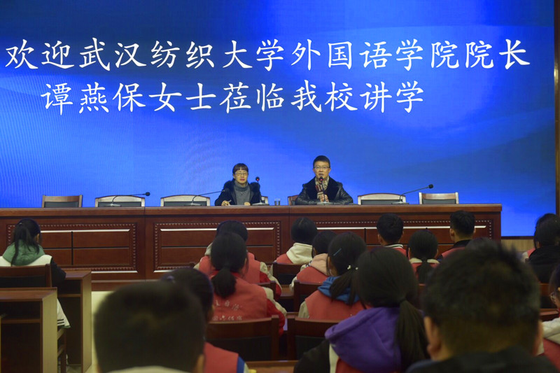 下午四时许,谭院长应邀在秭归一中五楼大会议室,以“英语学习”为主题展开讲学活动。讲座中,谭院长首先引用一处“网络语段”佐证出当前社会中存在着的“语言狂欢”现象,引发在座五百余名学生的极大兴趣与高度关注;接着,她以中英映射于文化生成与社会形态上的差异性展开剖析,并与学生展开积极互动。随后,她围绕学生高中阶段英语语法写得的痛点、难点——时态、动词非谓语等进行具体实例讲解,在引发在座学生广泛共鸣的同时也自然过渡到对“汉语诗意性”的阐释。除此之外,谭院长还结合大学课程《英语写作》为学生们讲解高中生写作中时常出现的错误与疏漏。