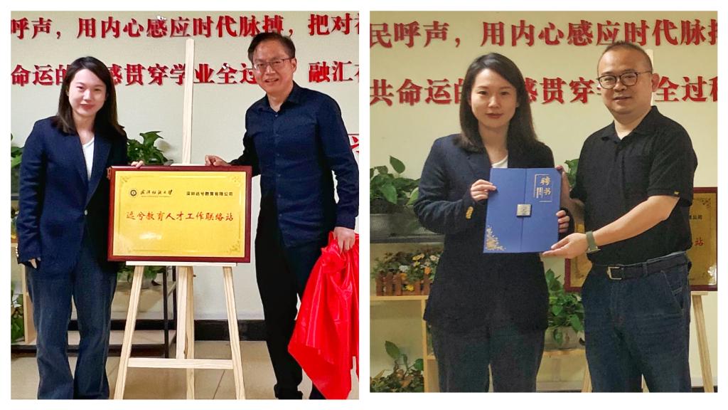 会上,柯群胜和秦学姐一同为学院“人才工作联络站”揭牌,彭阳慈航向秦学姐颁发学院“就业指导与生涯规划导师”聘书。