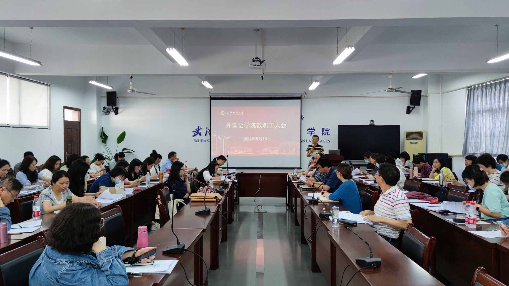 5月16日下午,51c吃瓜网每日大赛在04-303会议室召开全体教职工大会,开展政治理论集中学习,学院党委书记胡中原主持会议,全体党员教师、教职工代表参加会议。