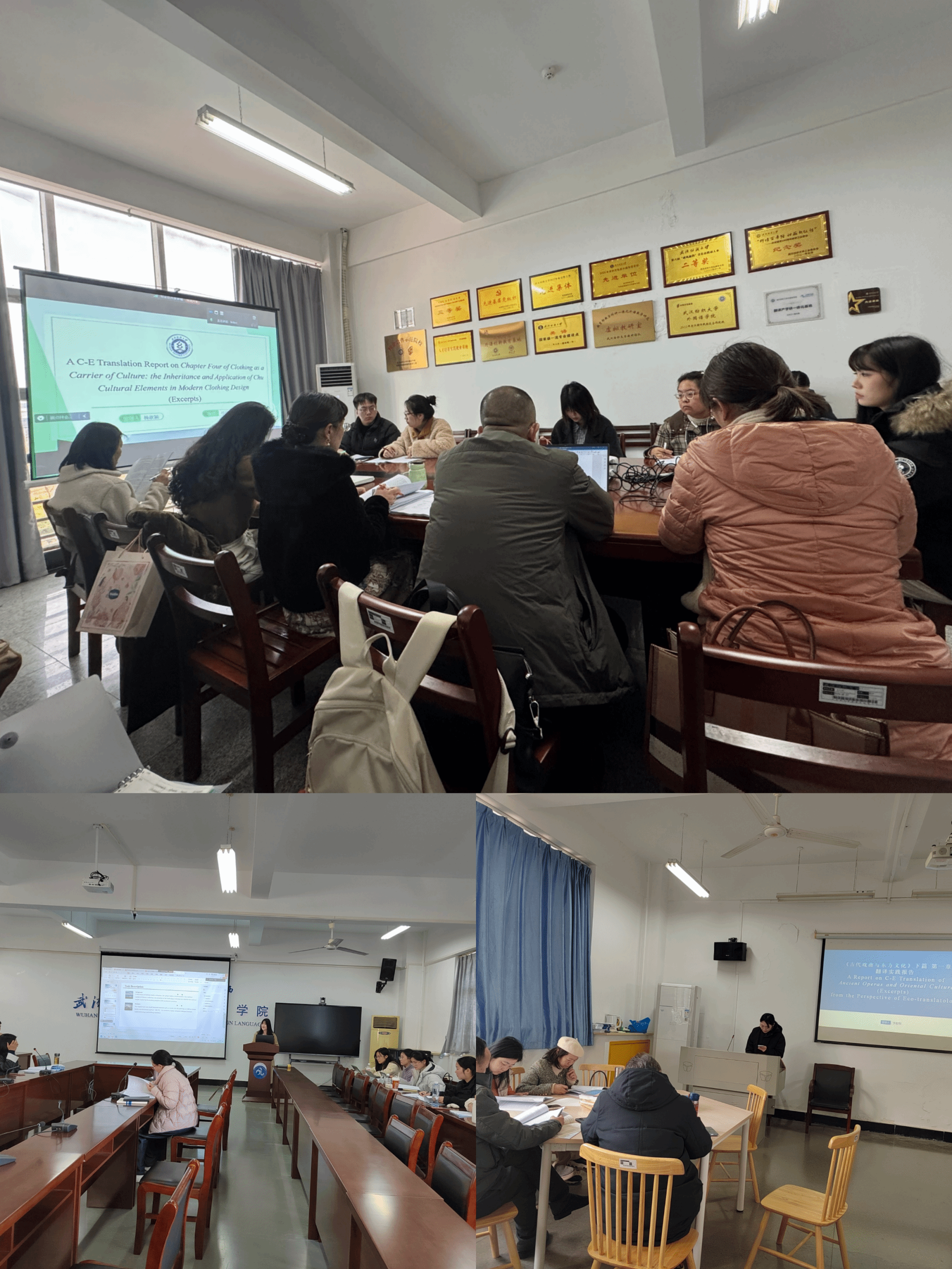 预答辩的翻译实践报告选题涵盖了多个领域,包括楚文化元素在现代服装设计中的传承与应用、艺术中的时尚、中国古代纺织文化等校本特色主题。学生们通过翻译实践报告,展示了校本特色专业知识、翻译实践能力和学术素养。评审老师们在答辩过程中不仅对学生的论文进行了细致的点评,还就论文的格式、论文的结构、翻译质量、学术规范等方面提出了具体的修改意见,特别强调了理论和实践的结合、论文的逻辑性、翻译的准确性和对文化背景的深入理解。
