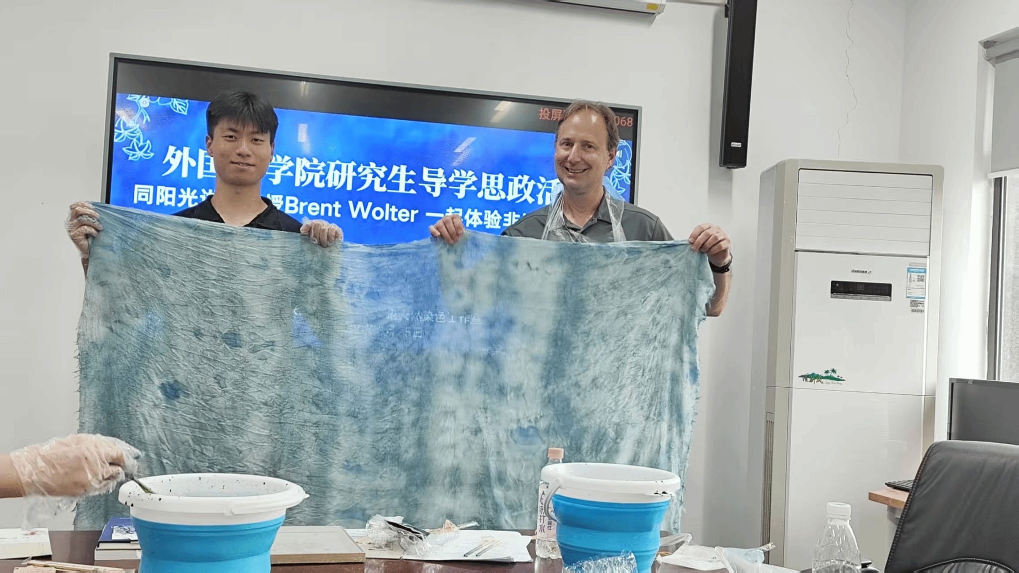 实践环节,Wolter教授与师生在王妮团队指导下,亲手体验千年绞缬技艺。从棉质围巾的扎花定型,到手扎捆扎的纹路创作,再到浸入靛蓝染缸的三分钟染色、反复氧化固色,最终拆解出冰裂纹理的瞬间引发阵阵惊叹。“That’s amazing!”Wolter教授轻抚渐变蓝纹感叹。这是他第一次亲身体验中国非物质文化遗产的制造过程。这正印证着"纺大染语"的品牌理念,以古法手绘让色彩在布帛起舞,让两千年的荆楚智慧化作传统与现代交融的文化使者。
