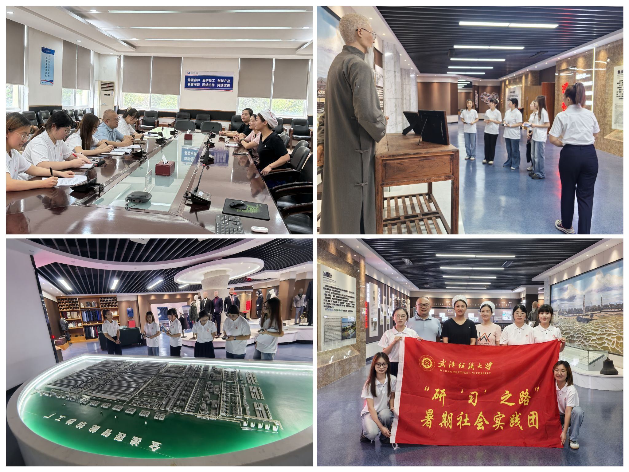 在裕大华企业展厅,一部跨越百年的纺织工业发展史生动呈现。从1919年裕华纱厂到现代智能制造的沧桑巨变,全国首条10万锭全流程智能纺纱生产线,见证了裕大华从“千人纱万人布”到智能制造的华丽转型。一根纱,从旧中国的“实业救国”到新时代的“实业强国”,一种百年恪守实业的坚守,让同学们深刻感受到民族工业传承的魅力与创新的活力。实践团与全国五一劳动奖章获得者吴娟娟,湖北荆楚工匠、武汉市劳动模范骆艳玉进行深入交流,聆听她们成长为行业标杆的故事。骆艳玉动容地说到:“因为有信仰,所以能择一事从一生,能够俯下身扎根一线,因为热爱所以能坚守,脚踏实地把每一个细节做好,把从师傅手里学到的继续交给年轻人。”同学们感受到从传统纺织到智能制造,不变的是纺织人“干一行爱一行精一行”的工匠精神和实业报国的使命担当。