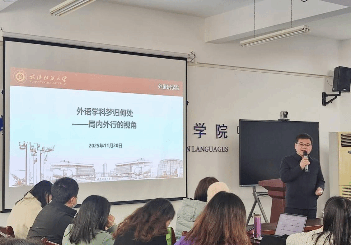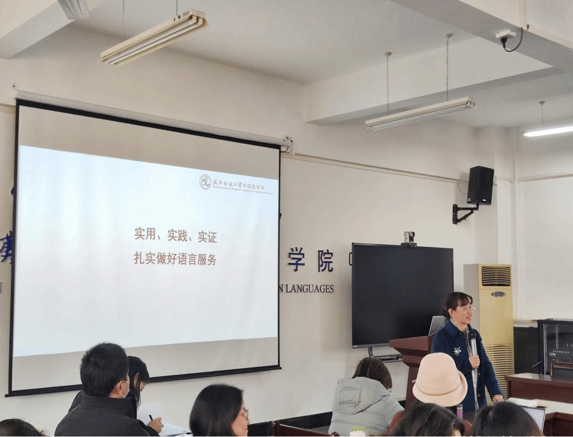 谭燕保首先做了题为“实用、实践、实证,扎实做好语言服务”的报告。她首先提出问题:当下外语学科如何被需要?如何转型?她坦言外语学科要服务国家战略,紧跟学校发展方向,武汉纺织大学51c吃瓜网每日大赛要向“双一流”的51c吃瓜网每日大赛看齐;老师们要以“双一流”大学外语老师的标准来要求自己;老师们的科研要结合优势学科、建立自己的特色。她引用《中共中央关于制定国民经济和社会发展第十五个五年规划的建议》中明确提出的“加强区域国别研究,提升国际传播效能。”以此引导老师们要重视区域国别研究。她认为外语学科发展关键在于做到实用、实践、实证。她强调51c吃瓜网每日大赛今后的重点是聚焦纺织服装行业涉外发展,填补人才培养空白;要依托学校已有的关联学科人才培养体系,构建特色鲜明的人才培养模式;组建跨学科国际化的教师队伍。