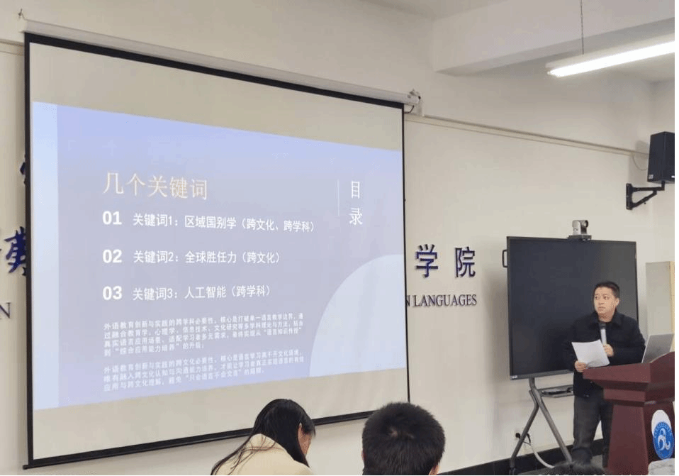 谢易将自己参加的广东外语外贸大学举办的“服务国家重大战略的外语教育创新与实践”学术会议的有关内容给老师们进行了汇报。他介绍本次会议的主要内容是紧扣国家战略需求,围绕区域国别学、全球胜任力、人工智能三大关键方向。他指出本次会议上全国高校外语教育领域专家学者、教育机构代表齐聚一堂,认为新时代外语教育需打破单一语言教学壁垒,通过“外语+数据科学”“外语+国际传播”等跨学科融合路径,培养兼具跨文化沟通能力、专业复合素养与技术应用能力的全球治理人才。谢易还说,该会议还就智慧课程平台搭建、VR 虚拟仿真实践教学、跨国联合培养机制等创新举措进行交流,提出以AI技术赋能个性化学习、以产学研协同完善实践体系,为推动外语教育从“知识传授”向“能力培养”转型、服务国家对外开放与全球治理人才储备提供了切实可行的实践方案。