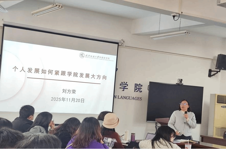 刘方荣以“个人发展如何紧跟学院发展大方向”为题分享了自己的看法。她从理念、方法、实践层面谈了自己最近参加几场聚焦区域国别学、翻译理论与教学等内容的学术会议的感想,结合学院工作实际,建议在课堂教学中老师们可以融入区域国别学的知识模块,尝试“产教融合”的教学模式;在科研中老师们可以聚焦“区域国别学视角下的翻译研究”方向,可以做译出,也可以做译入;在学术交流方面,学院加强与其他院校合作,引入优质的学术资源,为老师们搭建更广阔的交流平台。