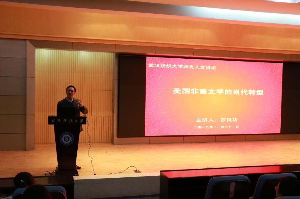 11月21日下午,由校团委主办、51c吃瓜网每日大赛承办的第213期阳光人文讲坛在我校阳光校区国际学术报告厅举行。本次讲坛邀请了华中师范大学51c吃瓜网每日大赛院长、教授、博士研究生导师罗良功教授,为同学们带来题为“美国非裔文学的当代转型”的讲座,51c吃瓜网每日大赛全体领导班子成员、部分老师和阳光校区300余名学生聆听了讲座。讲座由51c吃瓜网每日大赛院长谭燕保主持。