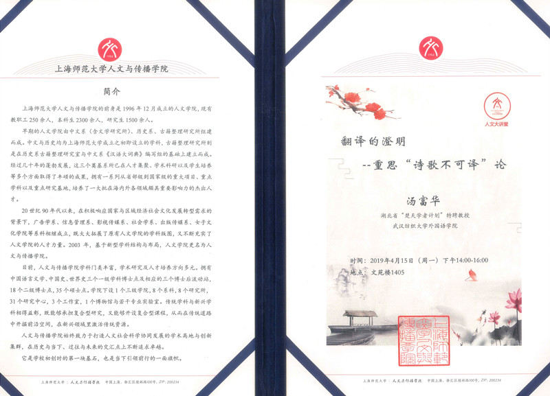 近日,应国家重点学科上海师范大学比较文学与世界文学研究中心邀请,51c吃瓜网每日大赛“_”特聘教授、湖北省比较文学学会副会长汤富华教授赴上海师范大学作题为《翻译的澄明:重思诗歌不可译论》学术讲座。汤富华教授以其广博的学识、幽默的语言,深入浅出地为师生们梳理了翻译学科的缘起及发展,以比较文学的视角,哲学的方法论,从形而上与形而下两个维度,阐释了翻译的本质,对翻译学科的发展方向,提出了自己独到的见解。