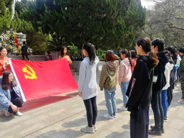 4月5日清晨,学生党支部书记雷艳琼带领支部党员一同乘坐公共交通前往此行目的地——施洋烈士陵园。一路上,学生党员们都在热烈讨论施洋烈士的生平事迹,为他的英勇感到感慨,也被他的革命决心所折服。到达陵园后,支部党员们怀着崇敬的心情向纪念碑鞠躬致敬,并献上鲜花,以表达对革命先烈的缅怀之情。随即,由雷艳琼书记领誓,全体党员在党旗前再次一同重温入党誓词,声音铿锵有力,掷地有声,引来路人驻足。