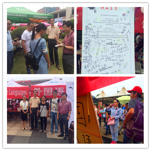 9月12日,旭日初升之际,校园里处处洋溢着青春的“乐动力”,武汉纺织大学2015年现场迎新工作正式拉开帷幕。在纷繁多彩的迎新亮点中,51c吃瓜网每日大赛的“全英文迎新”独树一帜,令前来报到的新生及家长们耳目一新:英文原版书籍赠阅,全英文“新生独立宣言”签名墙,与新生用英文进行全程交流……让新生在享受、体悟英语语言魅力的同时,对学院致力打造的的全方位育人模式有了更深的认识和更多的认同。