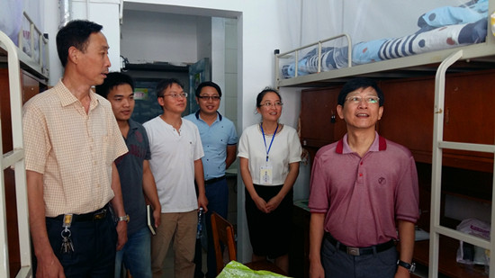 9月12日下午,学院班子成员及2015级新生导师代表、全体辅导员、学院办公室人员由院长何畏教授和分党委书记陈利民教授带队,深入走访了每一个新生的寝室,亲切看望2015级新生。