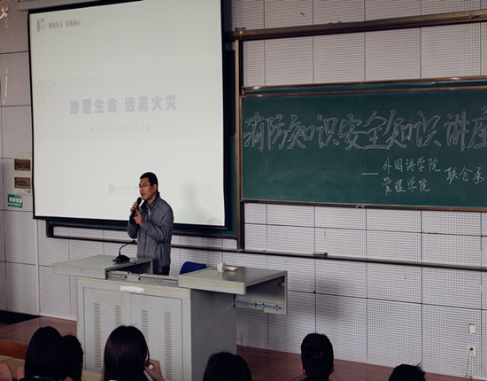 本次讲座分为两个环节进行。首先,保卫处武猛处长结合消防安全制度以及全国其他高校火灾案例,对如何树立公共消防意识、预防、杜绝可能引起消防事故的内外隐患、个人面对突发火灾事故应如何进行救灾及逃生等方面进行了全面的讲解。随后,武处长展示学校宿舍查寝时的安全隐患图片,带领在场的同学们共同学习了各种火灾隐患,让每个学生都重新认识了一些日常生活中的危险情形,特别是平时可能大家不会注意到的地方,进一步加深了同学们对校园消防安全知识的了解。