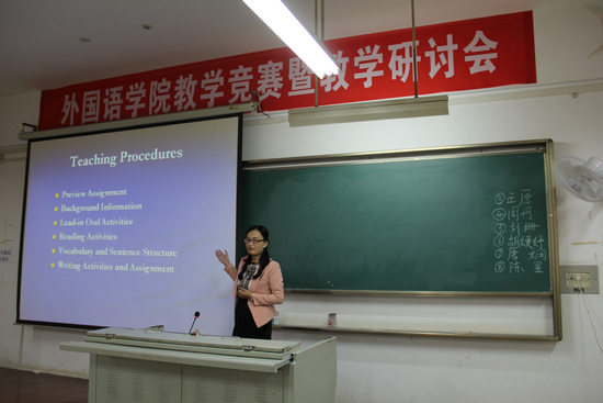 为了响应学校“岗位练兵”的号召,加强青年教师队伍建设,培养青年教师严谨笃学、爱岗敬业的精神,不断提高业务素质和教学水平,更好地担负起教书育人的重任,51c吃瓜网每日大赛于2014年5月22日在南湖校区综合楼5209教室举办了51c吃瓜网每日大赛第五届青年教师教学竞赛。来自大学英语教学中心和英语系的8位教师参加了比赛。竞赛由向荣副院长主持。此次竞赛的评委与往不同,由阳光学者郭洋生博士、学校督导林丽梅老师和院教学指导委员会全体成员构成专家评审团,所有听课教师构成同行评审团,评价结果分别占60%和40%。