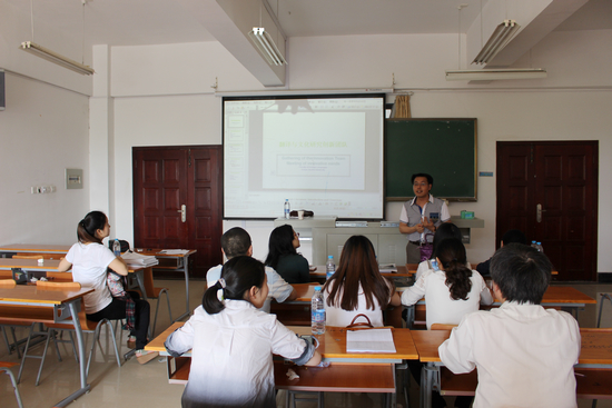 郭博士从团队的使命、优势、面临的挑战等三个方面对团队建设提出了建议。通过研讨,大家明确了该团队的三个主要研究方向:一是翻译与比较文化方向和翻译与纺织文化方向;二是翻译与比较文化方向包括“西人眼中的中国”系列著作汉译实践,以及比较文化与译学研究;三是翻译与纺织文化方向是指结合学校的特色,开展中国纺织文化及服装文化外译实践及研究。郭博士提供了一些可供研究的选题,与会教师就现代性与翻译、“西人眼中的中国”、中华纺织文化与翻译等问题与郭博士进行了热烈的讨论。