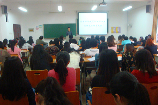 大会伊始,何畏院长从往届毕业生就业类型、地域、行业及就业率等方面介绍了我院近年来毕业生就业总体情况,并将毕业生考研院校、专业方向及出国情况为考研的毕业生做了数据分析和指导,他希望同学们在完成学业基础上将找工作和考研相结合,分析自我,了解市场,有信心、有准备地迎接毕业季的到来。向荣副院长就2013和2014年我院研究生招考情况、考研方向及考试科目进行了介绍,极力鼓励同学们积极报考本院研究生。柯群胜副院长向毕业生宣布《武汉纺织大学外语学院考研指导工作方案》,加大了同学们的考研积极性,详细介绍了 “一对N”(N≦3)考研跟踪辅导服务和录取奖励制度。随后,英语系罗绮伦主任根据学院考研指导工作方案做“1对N”考研导师安排,为导师与考研学生搭建起指导沟通的桥梁。卫冬妹副书记结合学生就业中的实际问题,给毕业生提出就业误区“8不要”,指导就业技巧,提醒就业安全。最后,陈国新书记做动员讲话,以“方法和态度决定一切”为主题,要求学生就业应有自主性和积极性,并提出了“统一认识、主动出击、统筹规划”三点指导意见。