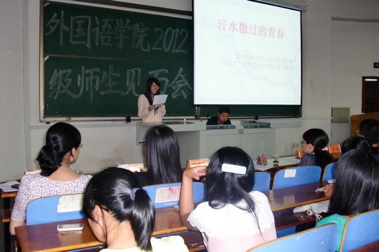 学院06级优秀校友、英国诺丁汉大学翻译学博士胡婉还应邀从海外发来视频寄语新同学:“希望学弟学妹们在大学四年能广交良师益友、融入集体生活、喜欢宿舍生活,多读书、读好书、勤思考,并且祝愿每一个新同学都能有一个健康、快乐、充实的大学生活”。老生代表、2012全国大学生英语风采大赛“星光奖”获得者英语11001班王梦甜以《汗水撒过的青春》为题,用流利的英语跟同学们分享了充实每一天,挑战自我,宠辱不惊的学习工作成长之路。学院培养的优秀学生代表成为大会一大亮点,让在场新生发出阵阵掌声和赞叹声。新生代表、高分入校的英语11201班顾水娴同学以《新生心语》为题的全英文发言,表达了全体新同学努力学习、共同进步、为学校争光添彩的信心。