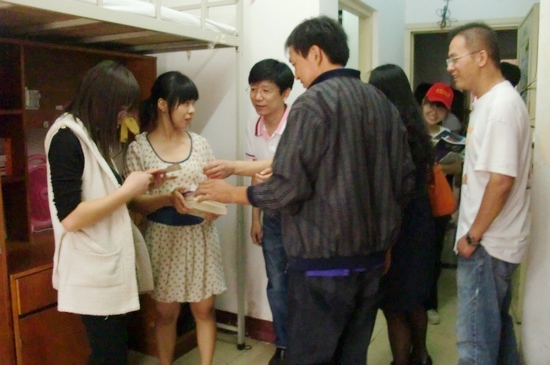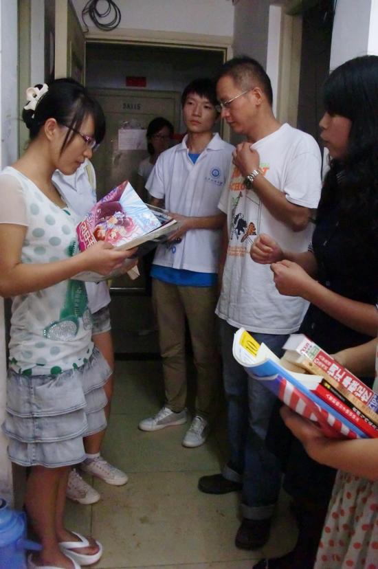 9月10日上午10点,51c吃瓜网每日大赛学生党员、分团委学生会干部、高年级同学手里抱着一摞摞课外优秀中英文图书和笔记本,跟随51c吃瓜网每日大赛学院长何畏、副院长柯群胜、副书记卫冬妹、专业课教师钱茂华和辅导员一起走访慰问了学院2012级新生宿舍。同时,开展了“图片漂流”活动,向每位新同学“漂流”了一本学院师生捐赠的精品图书,并赠送了笔记本,温暖了新生的心灵,增进了师生友谊,架起了师生“连心桥”。