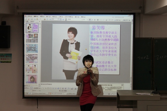 讲座伊始,易芙蓉老师老师就用韩语给大家打招呼,同学们立刻就被易老师流利地道的韩语给吸引住了。易老师首先给同学们介绍了她的经历:她拥有最大的150人小语种教学团队、“中国韩语创记录班首位讲师”,培养多名大学生在大学毕业前就能自己负担自己的学费和生活费,激励数千名大学生找到自己的目标和梦想。