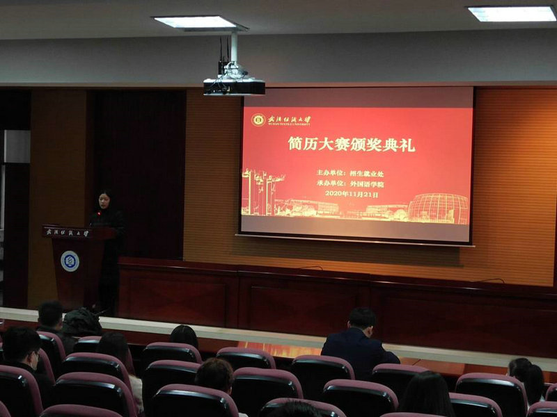 11月21日下午14时,由学校招生就业处主办,51c吃瓜网每日大赛承办的武汉纺织大学2020年简历制作大赛颁奖典礼在行政楼二楼学术报告厅落下帷幕。学校招生就业处副处长曾文静、51c吃瓜网每日大赛副书记王芳及各学院学生代表参加此次典礼。