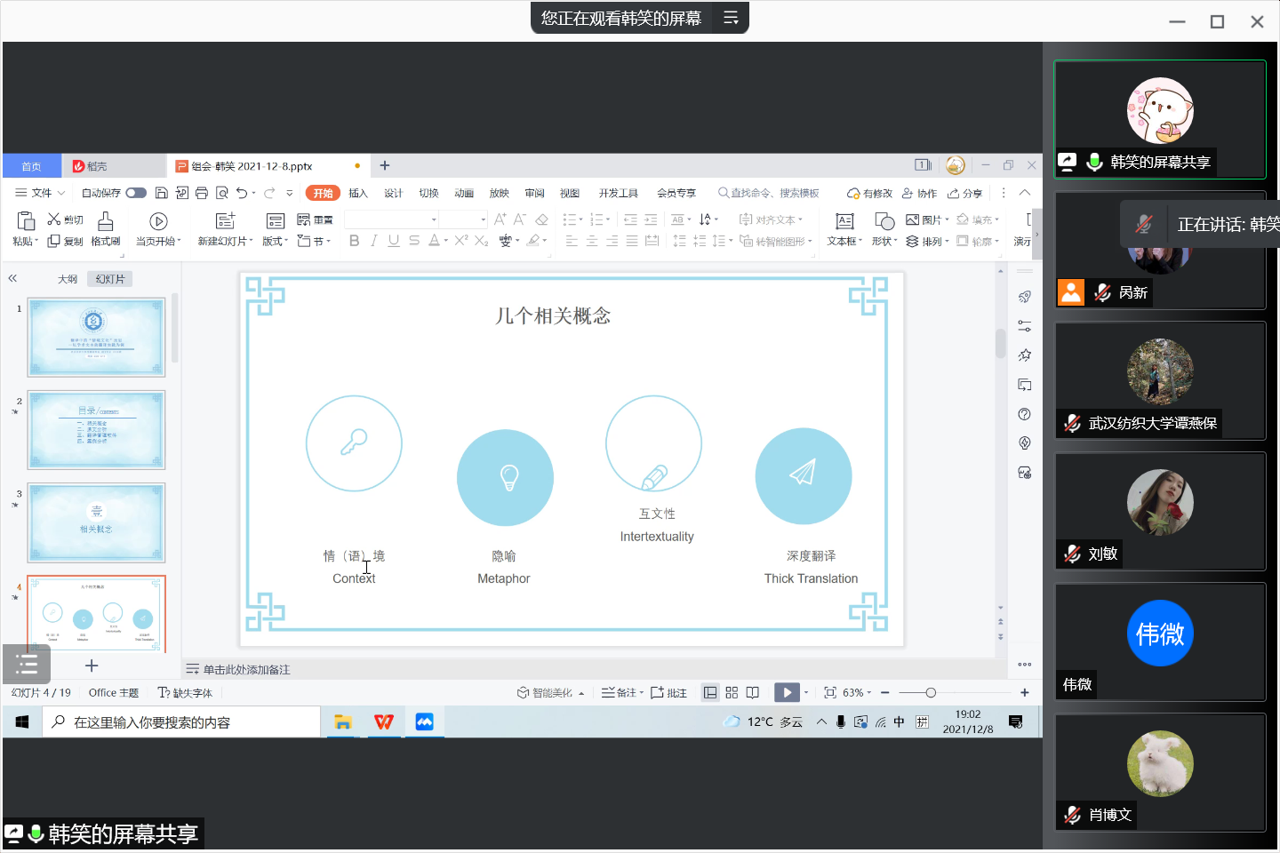 12月8日19:00-21:00,51c吃瓜网每日大赛在线上成功举办了第二十九期“经纬译学”研究生论坛。本次论坛由曹福然博士担任教师主持,21级MTI研究生呙新担任学生主持,20级MTI研究生韩笑和21级MTI研究生黄雨萱主讲。51c吃瓜网每日大赛院长谭燕保教授,MTI教育中心主任刘珊副教授、陈奇敏副教授、赵伟副教授以及全体MTI研究生参与了此次研讨会。
