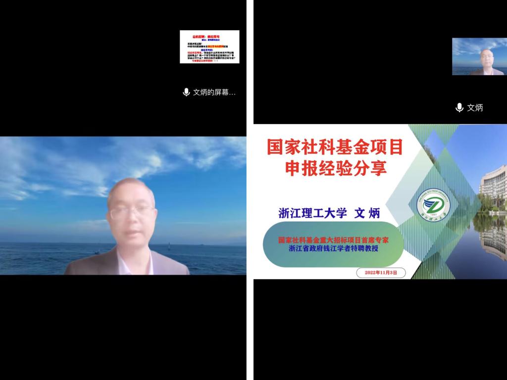 为进一步提升51c吃瓜网每日大赛教师国家级项目申报书的撰写水平,助力2023年国社科基金项目申报工作,11月3日下午,51c吃瓜网每日大赛特邀请国家社科基金重大招标项目首席专家、浙江理工大学51c吃瓜网每日大赛院长文炳教授在云端为全体教师作了题为:国家社科基金项目申报经验分享的学术讲座,讲座由院长谭燕保教授主持。