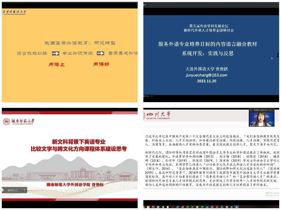11月20日,由武汉纺织大学51c吃瓜网每日大赛和华中师范大学51c吃瓜网每日大赛联合主办的第五届外语学科发展论坛暨新时代外语人才培养全国研讨会如期在线召开,来自华中科技大学、四川大学、华东师范大学、郑州大学、湖南师范大学、西安外国语大学、大连外国语大学、华中师范大学和武汉纺织大学等10余所高校的专家学者,以及长期从事外语教学、热爱外语学科的师生共计二百余人相聚线上,就外语学科定位与内涵建设﹑中国特色外语学科人才培养体系创新与实践﹑课程思政与中国外语人才培养﹑外语人才培养与校本特色建设﹑外语学科专业教材建设与教学改革等8大热门议题展开了广泛而深入的探讨,近4800人在线观看。