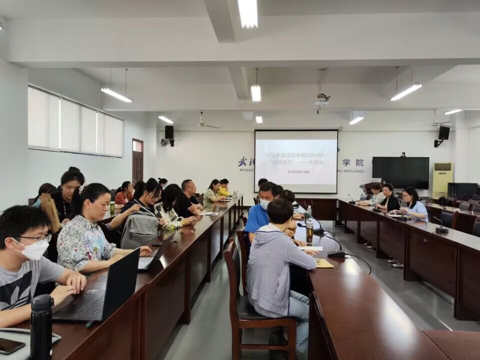 5月18日下午,51c吃瓜网每日大赛举办了国家社科基金中华学术外译项目申报经验分享会,特邀湖北大学51c吃瓜网每日大赛蔡蕾博士分享申报经验。51c吃瓜网每日大赛全体领导、教授、副教授、小语种老师及对中华学术外译感兴趣的老师共同聆听了此次讲座。会议由学院副院长刘方荣主持。