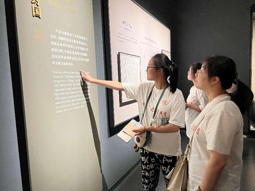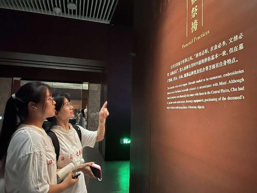 在湖北省博物馆,通过“楚国八百年”“越王勾践剑”“曾侯乙展厅”等专题展览,实践团成员认真观察以前只能在新闻和图片中看到的文物,仔细记录每个展区的历史文化背景和独特文化故事,精细研读每段展区的英文翻译,将自身专业优势和中华优秀传统文化相结合,用大学生的视角探寻荆楚文化外译现状。