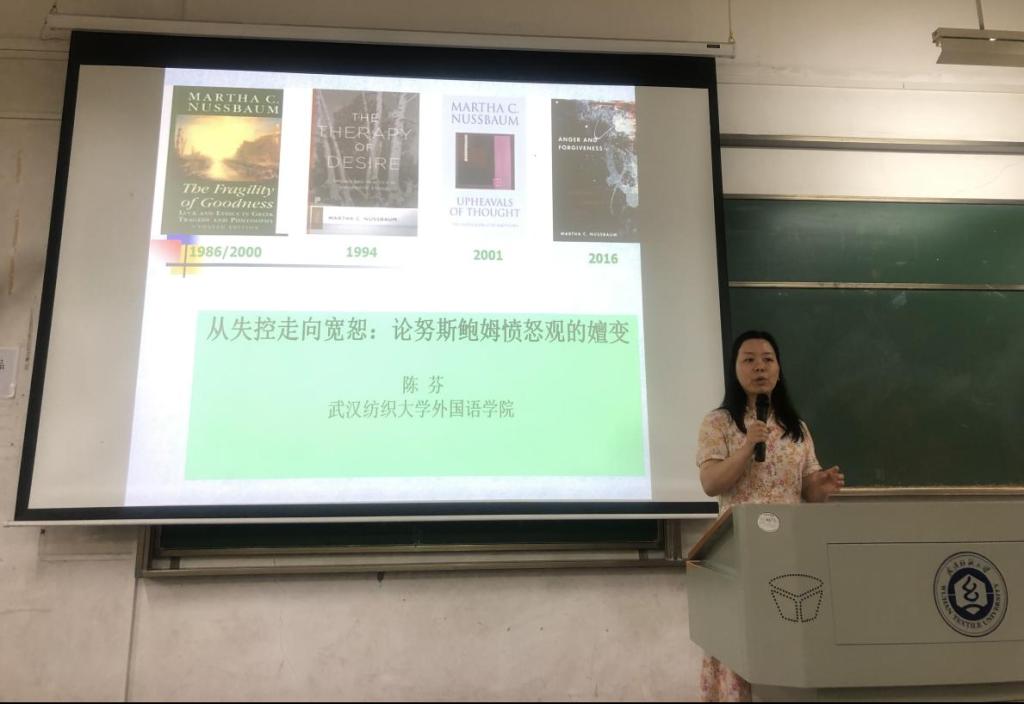 第三位汇报的是陈芬博士。她分享的成果题目为:从失控走向宽恕:论努斯鲍姆愤怒观的嬗变。她的分享从选题意义开始。她说,情感理论是当今文学研究中比较热门的理论视角。美国作家努斯鲍姆的作品中丰富的情感因素触动了她的研究。接下来,她对作品中“愤怒”的嬗变过程进行了描述,并从作家自身的思想变化阐释了嬗变的原因。同时,她还对自己当前的研究进行了反思,提出了困惑。最后,她还介绍了国内文学情感研究的前沿成果,并邀请感兴趣的老师也能参与到该研究领域来,扩宽学术研究视野。