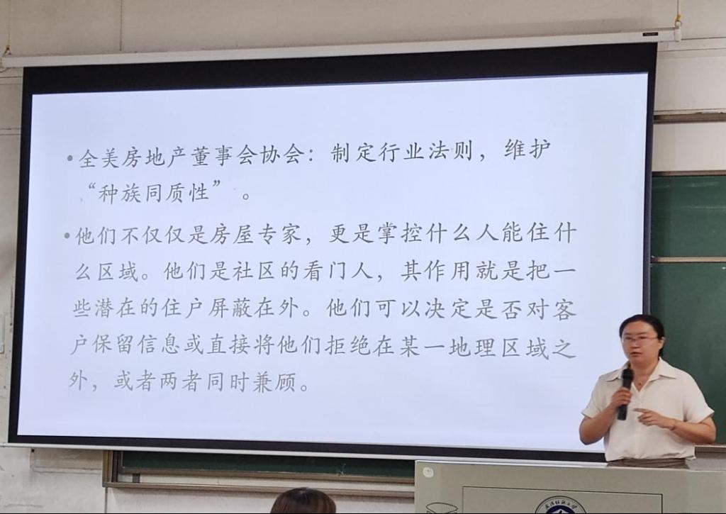 首先进行汇报的是张守慧博士。张博士在2022年成功立项国社科项目,她为大家带来的题目是:20世纪中期美国居住隔离中的房地产商因素。她首先给大家介绍了选题的历史背景和选题的问题驱动。她说,二战以后,美国种族隔离制度对房屋销售策略的影响是很明显的,它阻碍了美国民权运动的发展,是美国民主历史进程中值得关注的现象。接下来,张博士详细介绍了房地产商常用的住房隔离手段,指出,这些手段的实施导致了黑人密集居住区成为第二代贫民窟,加剧了白人与黑人之间的矛盾。最后,她分析了住房隔离措施的内在动力。无论是政府的政策支持,还是房地产行业和白人阶层对自身利益的维护,三管齐下,保证了隔离制度在居住区域的有效推行。最终,美国的种族矛盾越来越激化,在相当长的时间里限制了社会的发展。
