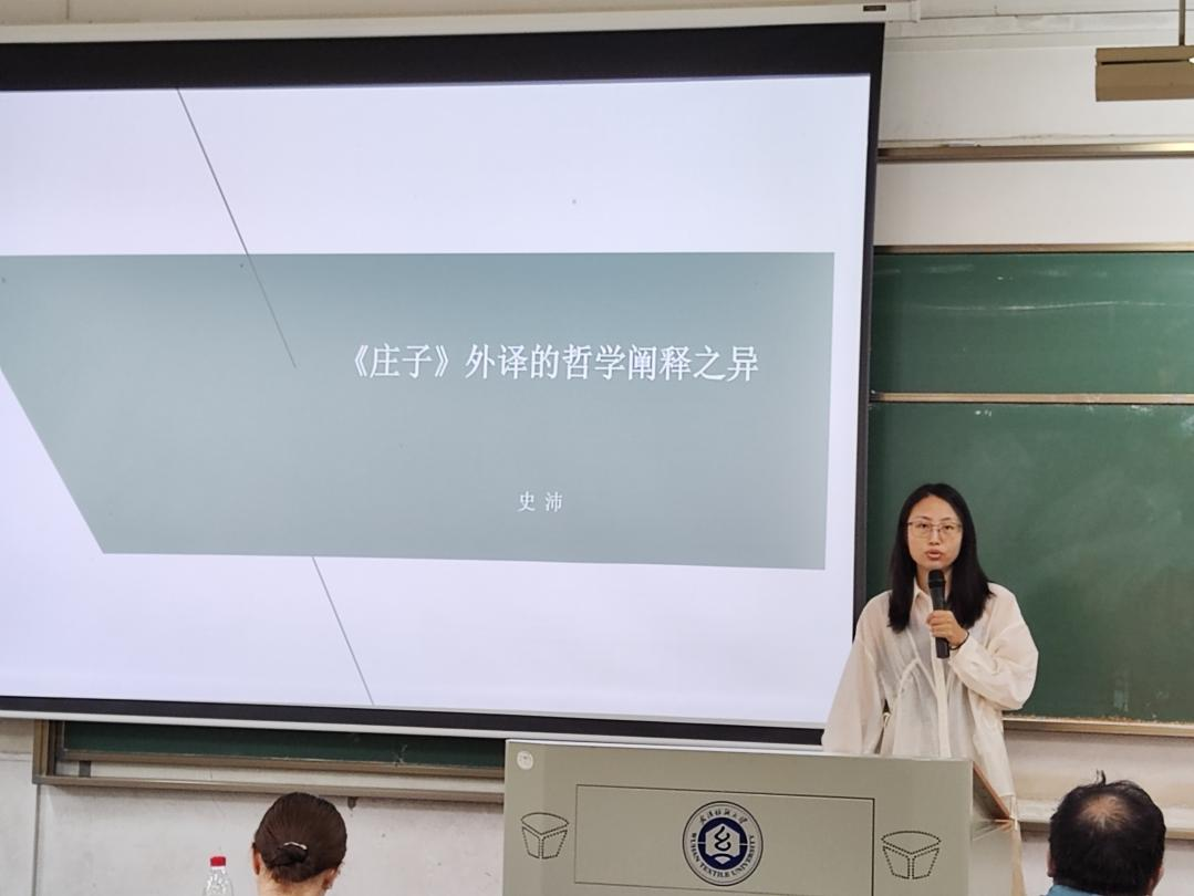 第二位汇报的是史沛博士,她带来的研究是:《庄子》外译的哲学阐释之异。史博士的研究方向是俄语文学翻译,她首先从不同的《庄子》俄译本出发,解释了其中的翻译机制。她指出,对于《庄子》这类哲理元典的翻译研究不仅要考虑到语言、文学形式和文化的历史性差异,更要考虑到译者对庄子哲学阐释的多元性。在第二部分,史博士对比了《庄子》俄译本中对哲学思想的呈现。她说,由于哲学文本表述形式和哲学思想阐释的差异,外国读者很难真正地理解文本中的精神内核。就这一点,她结合了20世纪西方哲学的本体论转向和几位代表译者的哲学思想,展示了《庄子》的20世纪俄译者与首位俄译者显著差异的表现及其产生的原因。最后,她总结到,只要译者对原文本的哲学阐释有所根据,就都具有其文学翻译价值和传播意义。